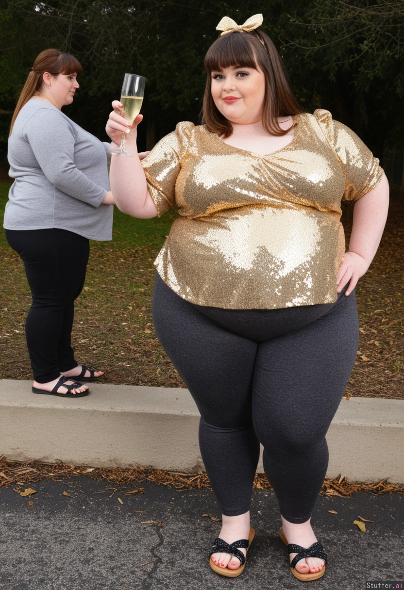 30 year old morbidly obese fat ssbbw oversized dark gold sparkled peplum blouse with sequins, oversized charcoal capri leggings, brown hair, brown eyes, bow in hair,glitter on Chubby cheeks, straightened hair, bangs, sandles, holding glass of champagne Side view Daytime New years eve outside park party with friends Fully clothed Fully covered View from side Hyper fat belly sticks out far in front Side view