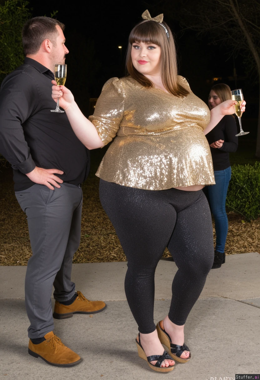 30 year old obese girl oversized dark gold sparkled peplum blouse with sequins, oversized charcoal capri leggings, brown hair, brown eyes, bow in hair,glitter on Chubby cheeks, straightened hair, bangs, sandles, holding glass of champagne Side view Daytime New years eve outside park party with friends Fully clothed Fully covered View from side belly sticks out in front Side view