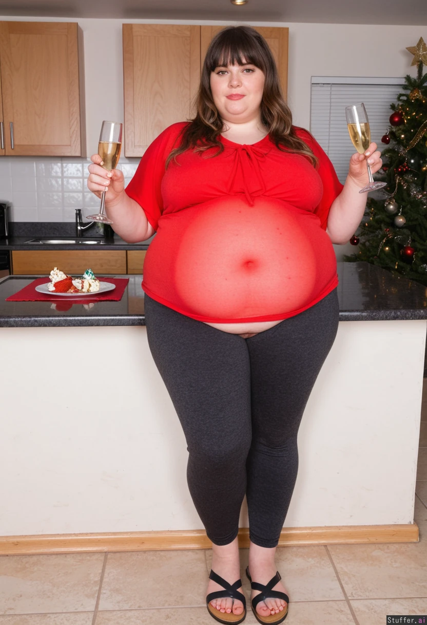 30 year old obese fat girl oversized red Christmas blouse, oversized charcoal capri leggings, brown hair, brown eyes, messy hair, bangs, sandles, holding glass of champagne Christmas lunch Fully clothed Fully covered Fat bloated belly sticks out far in front