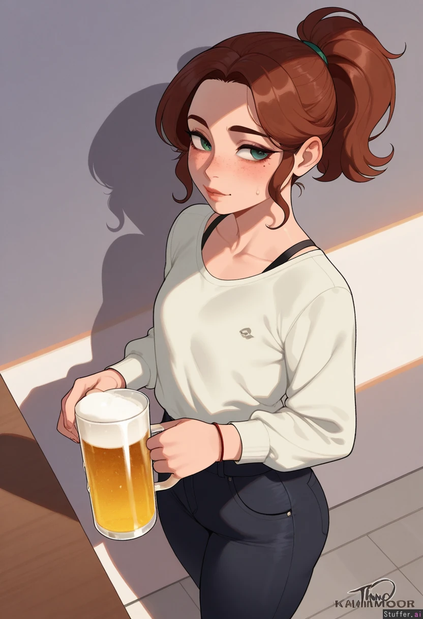 (highly detailed, best quality), (perfect lighting, vibrant colors, shadow, perfect shading), (Krekkov (artist), KAMII MOMORU (artist), nyantcha (artist)), solo, adult, (Brown bangs and ponytail, green eyes, mascara, mole under eye, freckles) Wearing: (plain white sweatshirt), (black jeans), (Flatchested), (Blushing), (drinking a beer), Skinny, (Chubby: 0.60),