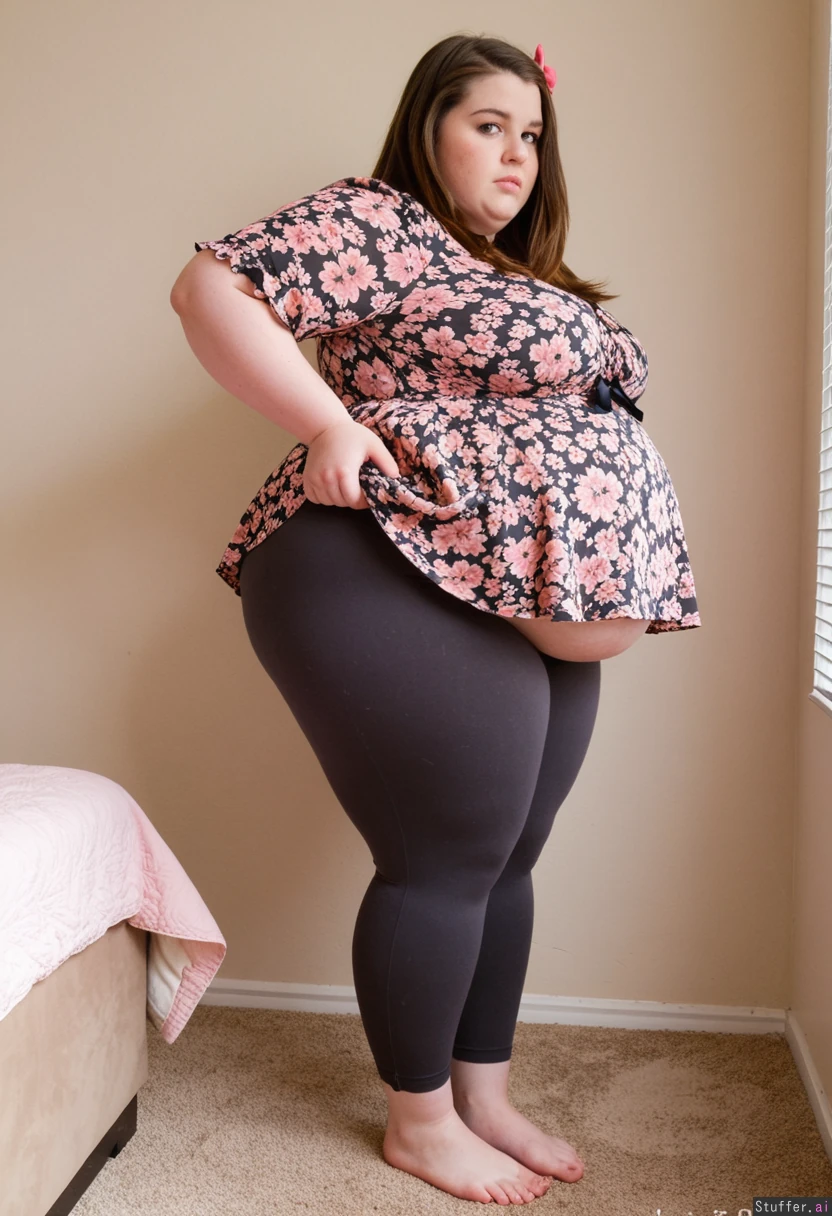Pretty 19 year old beautiful obese fat ssbbw, brown hair, brown eyes, charcoal capri leggings high waistband, oversized pink floral peplum blouse, barefeet, standing, straightened hai, bow in hair Daytime Fully clothed, fully covered Standing View from side bloated gut Ultra massive fat round bloated belly Fat round belly pokes out far in front Clothes covering belly