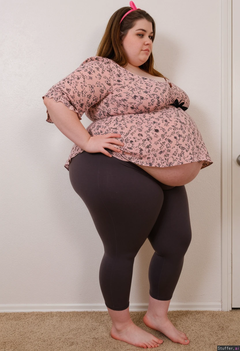 Pretty 19 year old beautiful obese fat ssbbw, brown hair, brown eyes, charcoal capri leggings high waistband, oversized pink floral peplum blouse, barefeet, standing, straightened hai, bow in hair Daytime Fully clothed, fully covered Standing View from side bloated gut Ultra massive fat round bloated belly Fat round belly pokes out far in front Clothes covering belly