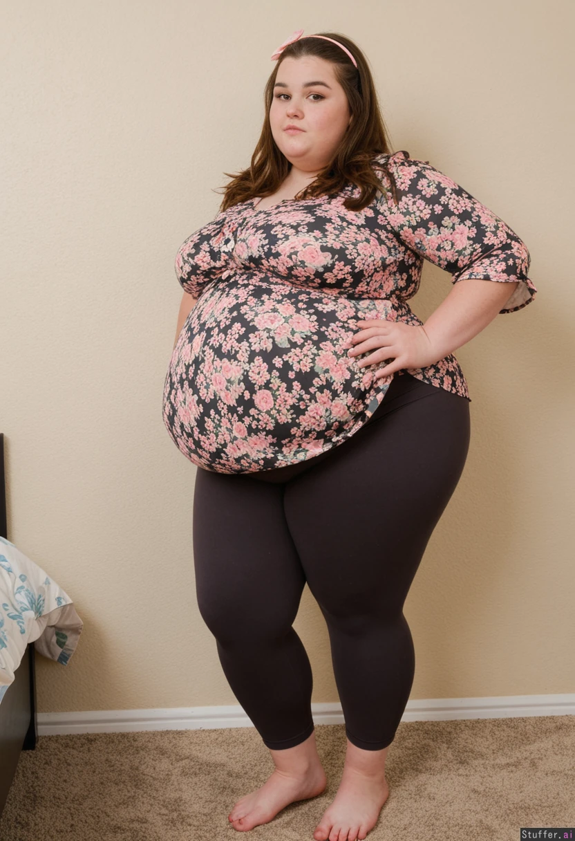 Pretty 19 year old beautiful obese fat ssbbw, brown hair, brown eyes, charcoal capri leggings high waistband, oversized pink floral peplum blouse, barefeet, standing, straightened hai, bow in hair Daytime Fully clothed, fully covered Standing View from side bloated gut Hyper massive fat legs Ultra massive fat round bloated belly Fat round belly pokes out far in front Clothes covering belly