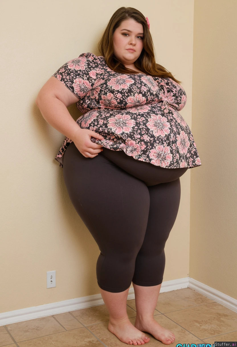 Pretty 19 year old beautiful obese fat ssbbw, brown hair, brown eyes, charcoal capri leggings high waistband, oversized pink floral peplum blouse, barefeet, standing, straightened hai, bow in hair Daytime Fully clothed, fully covered Standing View from side bloated gut Hyper massive fat legs Ultra massive fat round bloated belly Fat round belly pokes out far in front Clothes covering belly Ultra wide massive fat hips Hyper massive fat arms