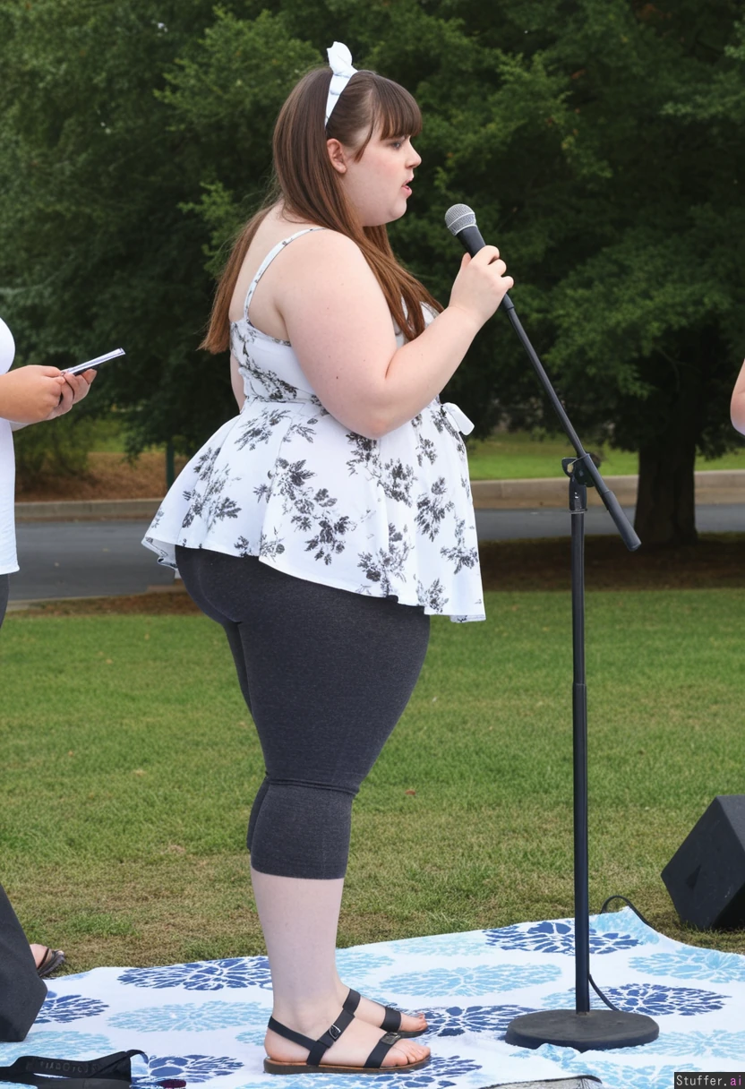 Pretty 19 year old obese fat plump fat girl, brown hair, brown eyes, charcoal capri leggings, oversized white Floral peplum dress, sandles, standing, straightened hair, bangs, bow in hair, talking into microphone Side view Daytime Fully clothed, fully covered Standing Engagement park party, giving speech View from side