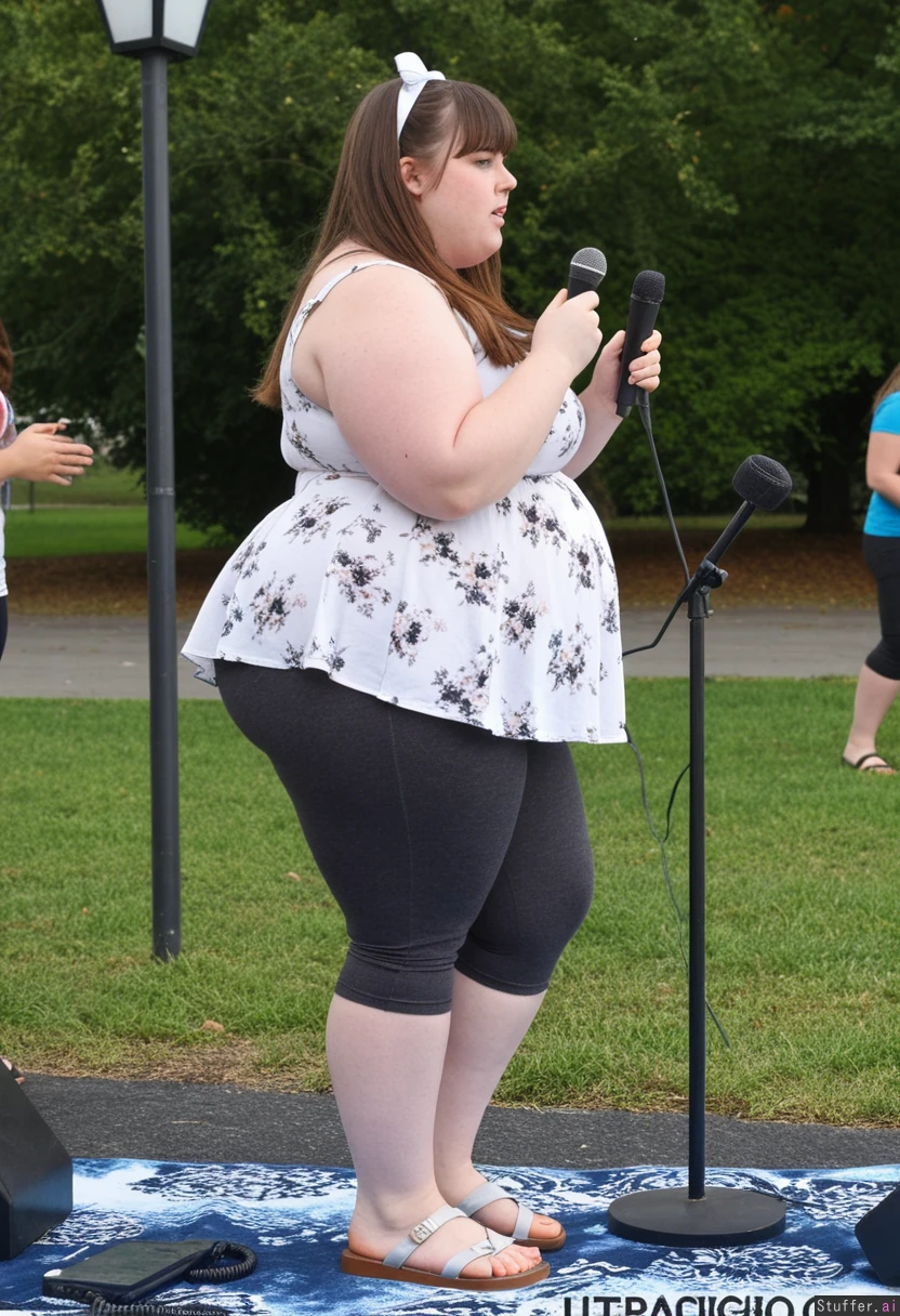 Pretty 19 year old obese fat plump fat girl, brown hair, brown eyes, charcoal capri leggings, oversized white Floral peplum dress, sandles, standing, straightened hair, bangs, bow in hair, talking into microphone Side view Daytime Fully clothed, fully covered Standing Engagement park party, giving speech View from side Ultra fat belly pokes out far in front