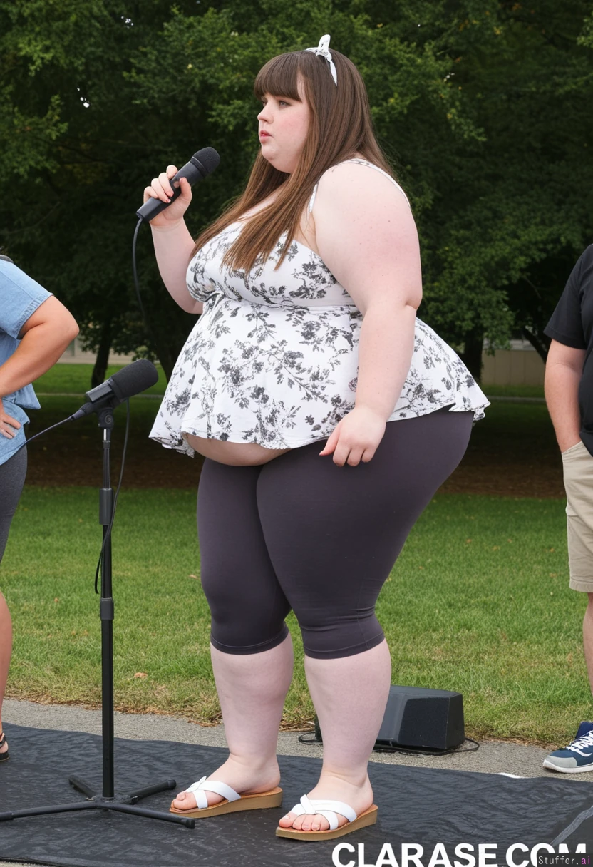 Pretty 19 year old obese fat plump fat girl, brown hair, brown eyes, charcoal capri leggings, oversized white Floral peplum dress, sandles, standing, straightened hair, bangs, bow in hair, talking into microphone Side view Daytime Fully clothed, fully covered Standing Engagement park party, giving speech View from side Ultra massive fat arms Hyper massive fat thighs Bloated gut Hyper massive fat legs Ultra fat belly pokes out far in front Chubby cheeks