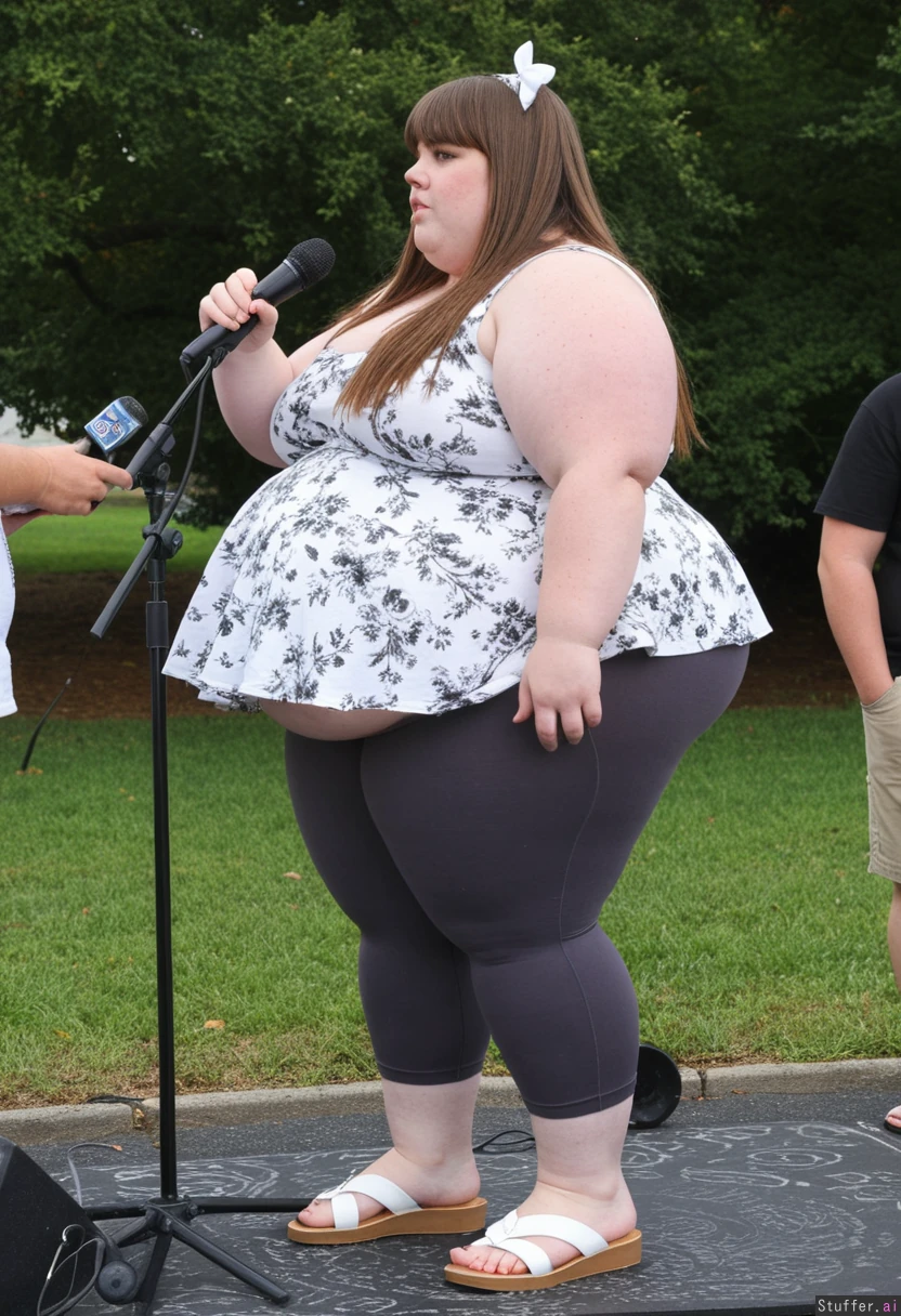 Pretty 19 year old obese fat plump fat ssbbw, brown hair, brown eyes, charcoal capri leggings, oversized white Floral peplum dress, sandles, standing, straightened hair, bangs, bow in hair, talking into microphone Side view Daytime Fully clothed, fully covered Standing Engagement park party, giving speech View from side Ultra massive fat arms Hyper massive fat thighs Bloated gut Hyper massive fat legs Ultra fat round bloated belly pokes out far in front Chubby cheeks Hyper massive fat thighs Ultra massive fat buttux Fat neck Impossibly fat