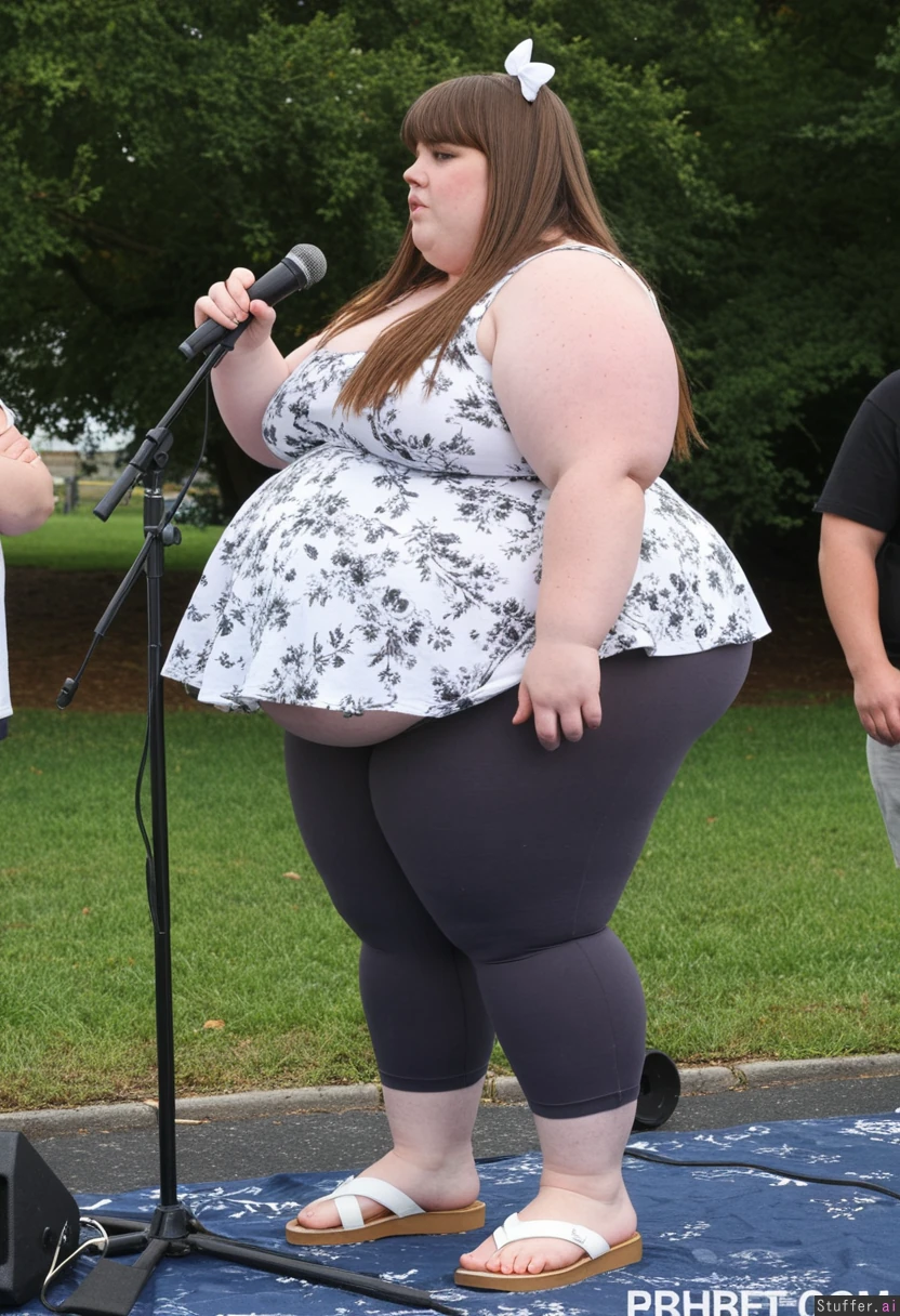 Pretty 19 year old obese fat plump fat ssbbw, brown hair, brown eyes, charcoal capri leggings, oversized white Floral peplum dress, sandles, standing, straightened hair, bangs, bow in hair, talking into microphone Side view Daytime Fully clothed, fully covered Standing Engagement park party, giving speech View from side Ultra massive fat arms Hyper massive fat thighs Bloated gut Hyper massive fat legs Ultra fat round bloated belly pokes out far in front Chubby cheeks Hyper massive fat thighs Ultra massive fat buttux Fat neck Impossibly fat Very bottom heavy