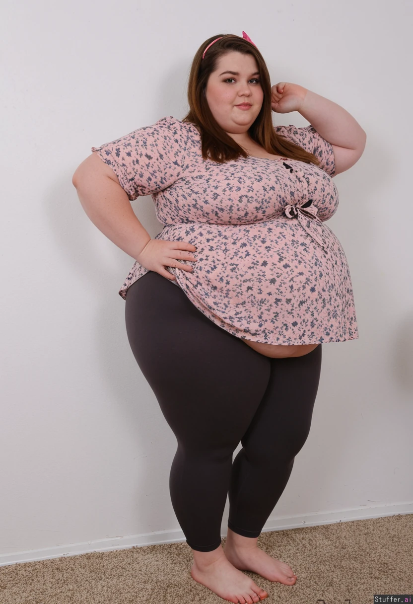 Pretty 19 year old beautiful obese fat ssbbw, brown hair, brown eyes, charcoal capri leggings high waistband, oversized pink floral peplum blouse, barefeet, standing, straightened hai, bow in hair Daytime Fully clothed, fully covered Standing View from side bloated gut Ultra massive fat round bloated belly Fat round belly pokes out far in front Clothes covering belly Face getting fatter Ultra massive fat arms Hyper massive fat legs Chubby plump cheeks Ultra wide massive fat hips Double chin Hyper massive fat thighs Bloated gut Fat blob