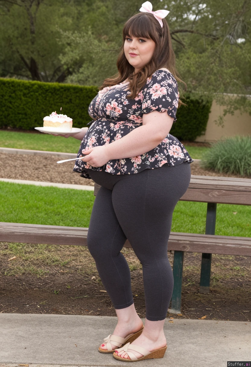 25 year old beautiful obese fat girl Charcoal capri leggings, oversized frilled pink floral peplum maternal blouse, sandles, brown hair, brown eyes, bow in hair, straightened hair, bangs, holding slice of cake View from side Park engagement party Fully clothed Fully covered Side view Side view