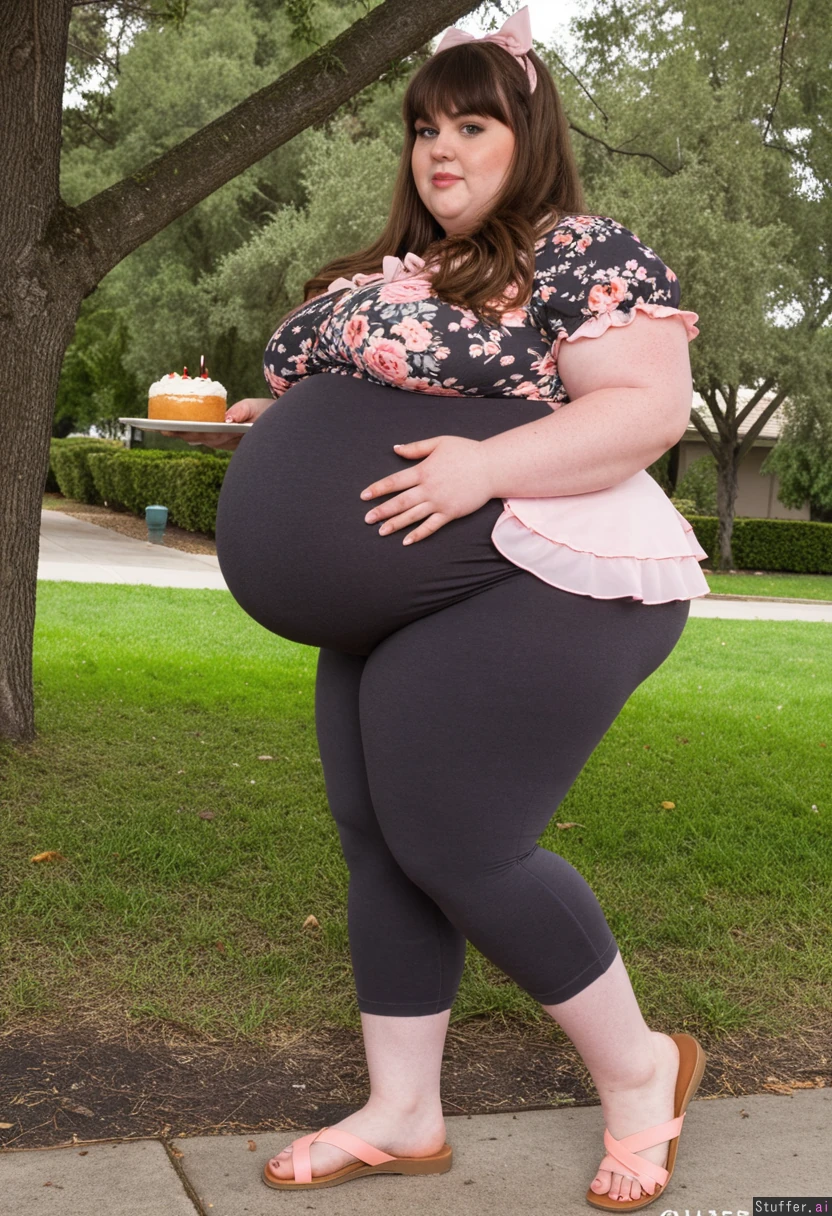 25 year old beautiful obese fat girl Charcoal capri leggings, oversized frilled pink floral peplum maternal blouse, sandles, brown hair, brown eyes, bow in hair, straightened hair, bangs, holding slice of cake View from side Park engagement party Fully clothed Fully covered Side view Hyper massive fat legs Ultra massive fat belly sticks out far in front Hyper massive fat arms Side view