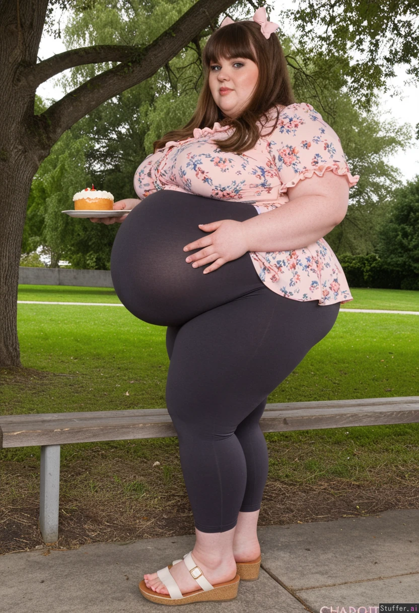 25 year old beautiful obese fat girl Charcoal capri leggings, oversized frilled pink floral peplum blouse, sandles, brown hair, brown eyes, bow in hair, straightened hair, bangs, holding slice of cake View from side Park engagement party Fully clothed Fully covered Side view Hyper massive fat legs Ultra massive fat belly sticks out far in front Hyper massive fat arms Side view