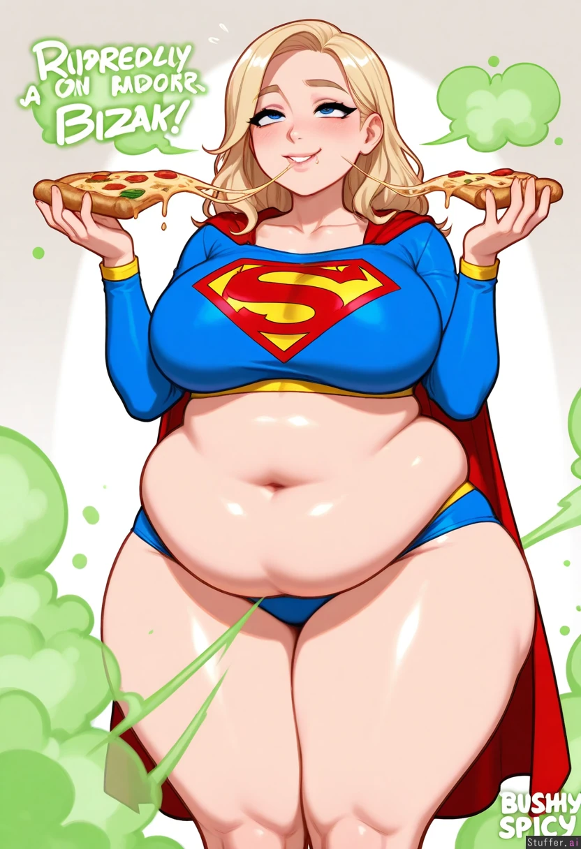 Tailblazer(artist), c.cu(artist), betterwithsalt(artist), blushyspicy(artist), full view, front view Character A = supergirl blonde, hyper obese, horny, massive hyper thicc butt, fat arms, fat neck, fat thighs)) (huge belly:1.5) large belly, large hips, fat hips, fat thighs, big ass, round ass, large_breasts, chubby face, cute face, very thicc, eating pizza, ahegao, fart, farting, green gas cloud coming from butt, (fat body:1.8), (huge butt:1.5)