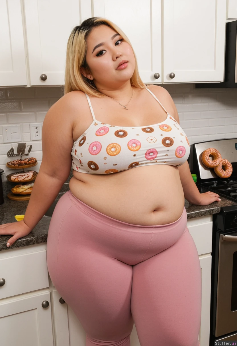 Beautiful 20 yo Korean woman, hair dyed blonde, huge pile of donuts on the counter, (((wearing summer top and pants))), navel piercing, necklace, standing in modern kitchen