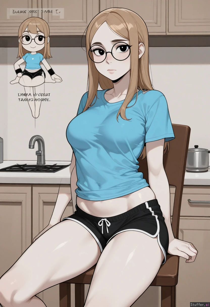 Solo, 1woman, Krekkov (artist), KAMII MOMORU(artist), (Flat colors), perfect proportions, (straight hair hair, light brown hair, no bangs), dark eyes, cute face, large cute eyes, pale skin, (((round glasses, blue t-shirt, black shorts))), (manga style drawing, (monochrome)), belly close up, (Semi side view), in a kitchen, sitting on a chair, medium breasts, ((Skinny)), large muffin top (shy), fat, (thick thighs, fat thighs, bulging thighs, wide hips:1.0), (overweight:1.0), (bigger belly:1.1), (bigger breasts:1.0), (skinny figure:1.7)