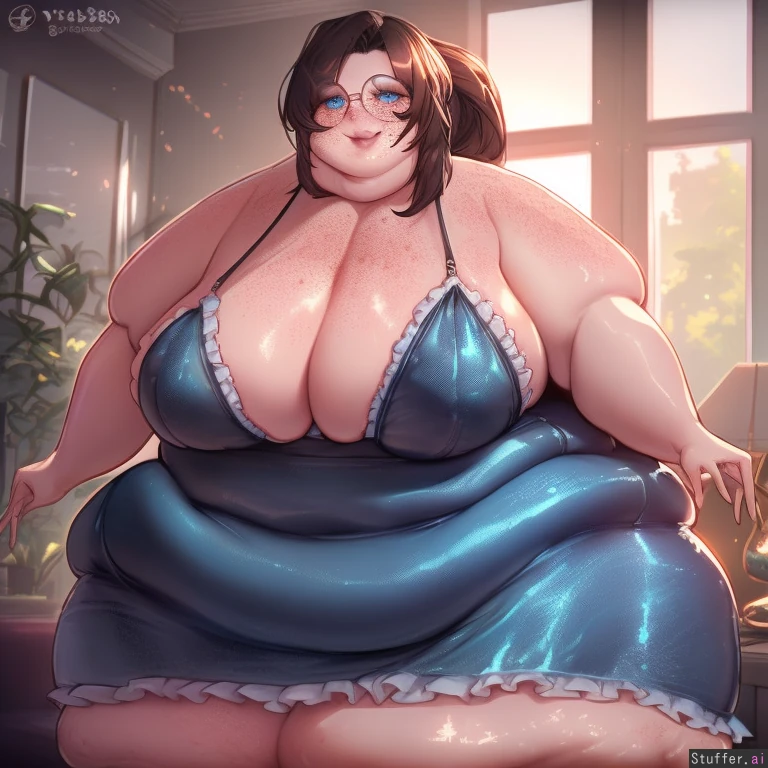 best quality, high rating, (hdr), (high detail), (dynamic lighting), (best quality), (high rating), spellsx(artist), ourobot, icecake, (1girl), (solo), (gorgeous face:1.5), (beautiful), cute, (detailed beautiful blue eyes), (brunette), ponytail, (round glasses), (freckles:1.4), (living room setting:1.2), (large plump lips:1.3), (seductive expression:1.3), (housewife outfit:1.2), (cellulite:.9), (shiny skin:1.2), cleavage, (sagging breasts), long blue dress, skimpy dress, (frills:1.2), (standing:1.2), (bbw:1.8), (fat face:1.6), (smile:1.2), (very fat:1.8), (closed mouth:1.2), (enormous hyper wide sagging hips:1.3),