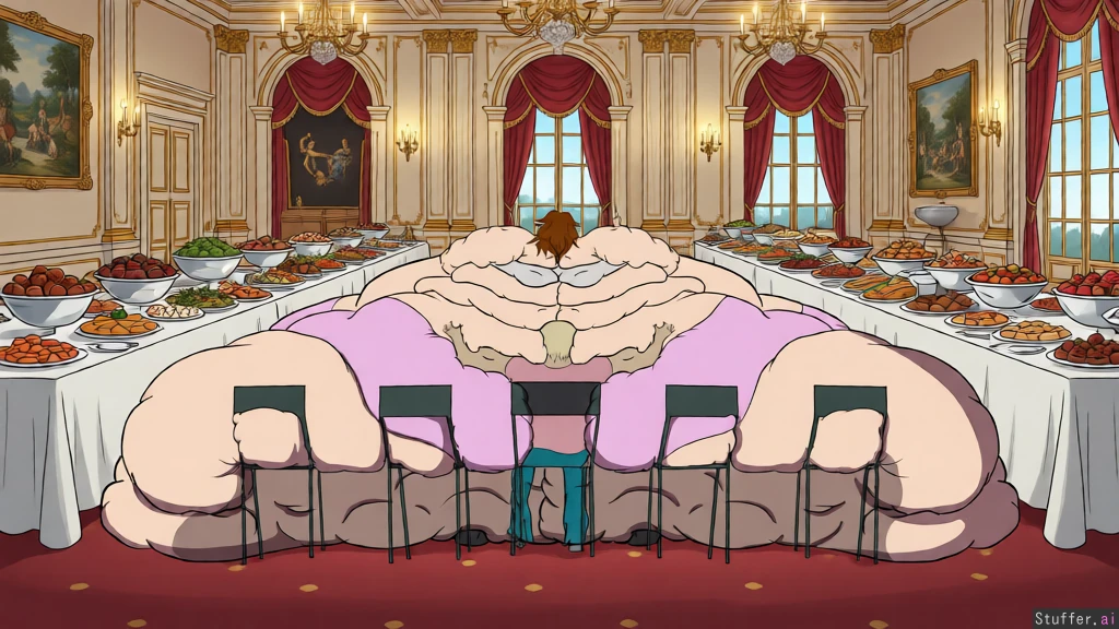 cartoon style, finish shading body, add lavish mansion background, tables covered in buffet food.