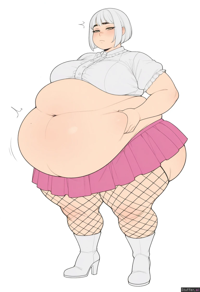 **base** ((High quality Illustration, flat color, solo, 1 woman)), ((perfect proportions, perfect anatomy)), KAMII MOMORU(artist), krekkov(artist), full body view, **appearance** ((female)), ((cute face, large breasts)), (big eyes, yellow eyes, half closed eyes, calm face), (bob cut, white hair), thick thighs, (Big hips), massive ass, (full of estrogen), (obesity:2.95), fat rolls, fat face, fat arms, ((double chin)), shortstack, (fat ass: 1.0) **clothing** fishnet stockings, white high heeled boots, short pink skirt, white blouse, **background** plain white background **pose** standing, belly pinching, frown,