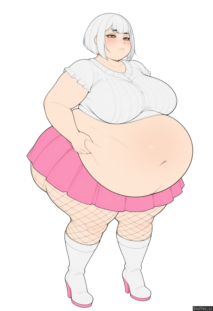 **base** ((High quality Illustration, flat color, solo, 1 woman)), ((perfect proportions, perfect anatomy)), KAMII MOMORU(artist), krekkov(artist), full body view, **appearance** ((female)), ((cute face, large breasts)), (big eyes, yellow eyes, half closed eyes, calm face), (bob cut, white hair), thick thighs, (Big hips), massive ass, (full of estrogen), (obesity:2.95), fat rolls, fat face, fat arms, ((double chin)), shortstack, (fat ass: 1.0) **clothing** fishnet stockings, white high heeled boots, short pink skirt, white blouse, **background** plain white background **pose** standing, belly pinching, frown,