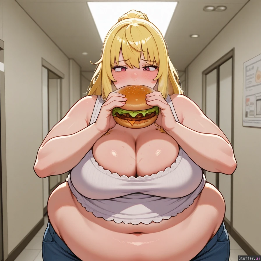 1girl,solo,beautiful,sakura_hibiki, burger in hand, ohasi art, 8k , blonde hair, pink eyes, beautiful, (backrooms), (out of breath, mouth open, tired), looking around ,worried, deep cleavage , messy, flirty , (obese:1.4), (ssbbw:1.5), big belly, food everywhere,