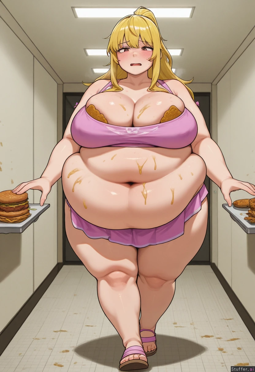 1girl,solo,beautiful,sakura_hibiki, walking, ohasi art, full body 8k , blonde hair, pink eyes, beautiful, (backrooms:1.3), (out of breath, mouth open, tired), looking around ,worried, deep cleavage , messy, flirty , (obese:1.4), (ssbbw:1.5), big belly, (burgers everywhere:1.5),