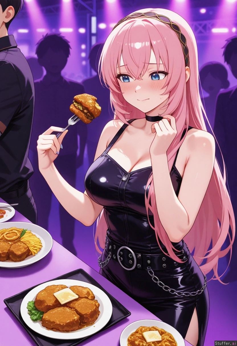 Megurine_Luka, typical clothing, nightclub, (many people trying to make her eat burgers and fattening food, she's blushing but eating it all up like she's told, ((handsome boyfriend is teasing her that she'll get fat!, boyfriend pinching her side, ((she is so embarrassed and blushes!)) High quality, high resolution.