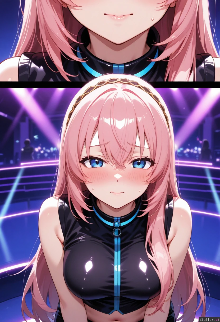 Megurine_Luka, typical clothing, nightclub, ashamed, blushing, anxious. She's gained weight and it shows! She looks softer with an erotically soft belly. Close up views of her blushing face and flabby body showing how erotically soft she is. High quality, high resolution.