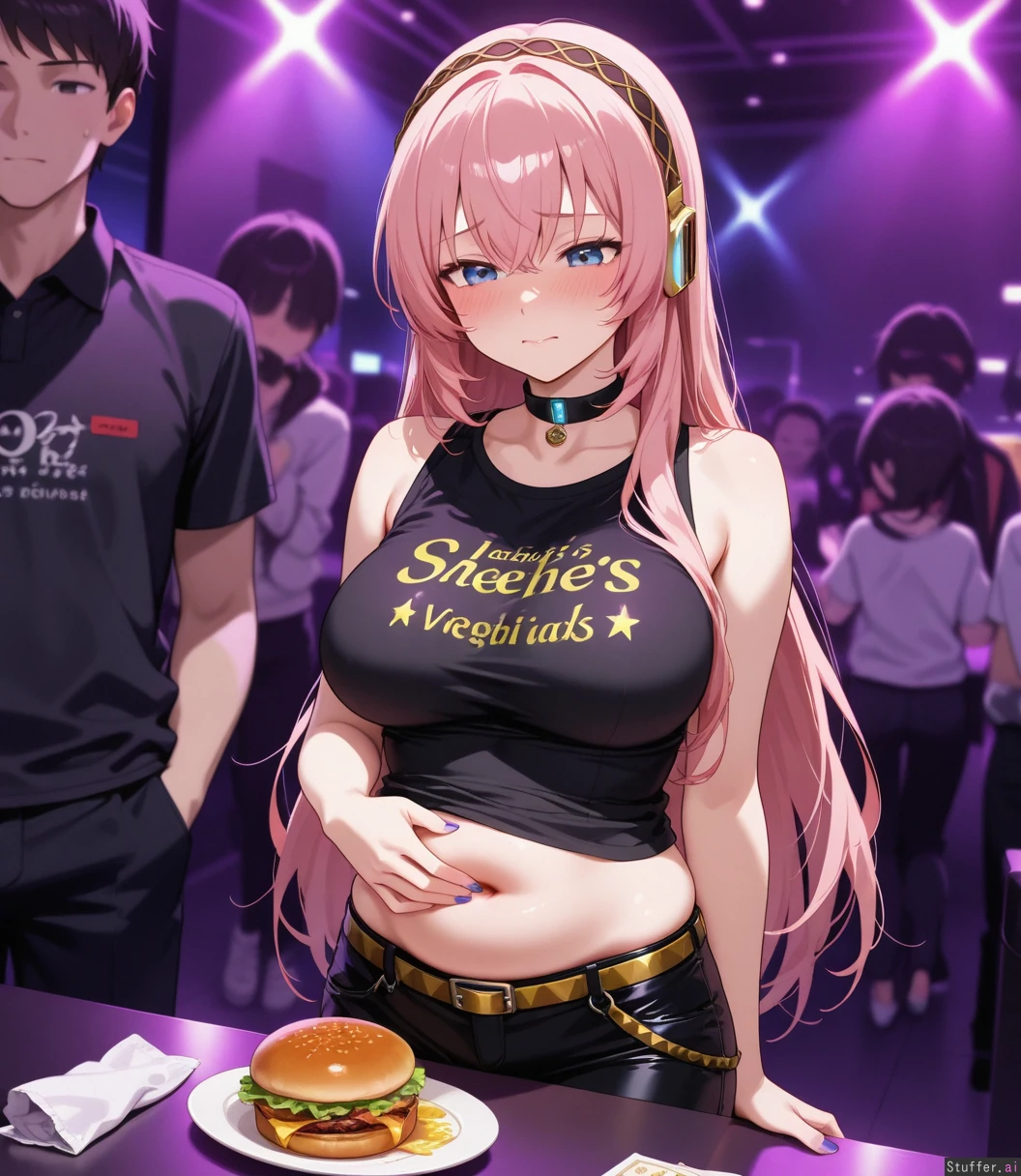 Megurine_Luka, typical clothing, nightclub, ashamed, blushing, anxious. She's gained weight and it shows! She looks softer with an erotically soft belly. she is munching on a burger as her handsome boyfriend rubs her tummy. High quality, high resolution.
