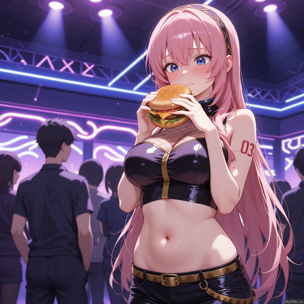 Megurine_Luka, typical clothing, nightclub, ashamed, blushing, anxious. She's gained weight and it shows! She looks softer with an erotically soft belly. she is holding a burger about to eat more as her handsome boyfriend holds her by her flabby waist. High quality, high resolution.