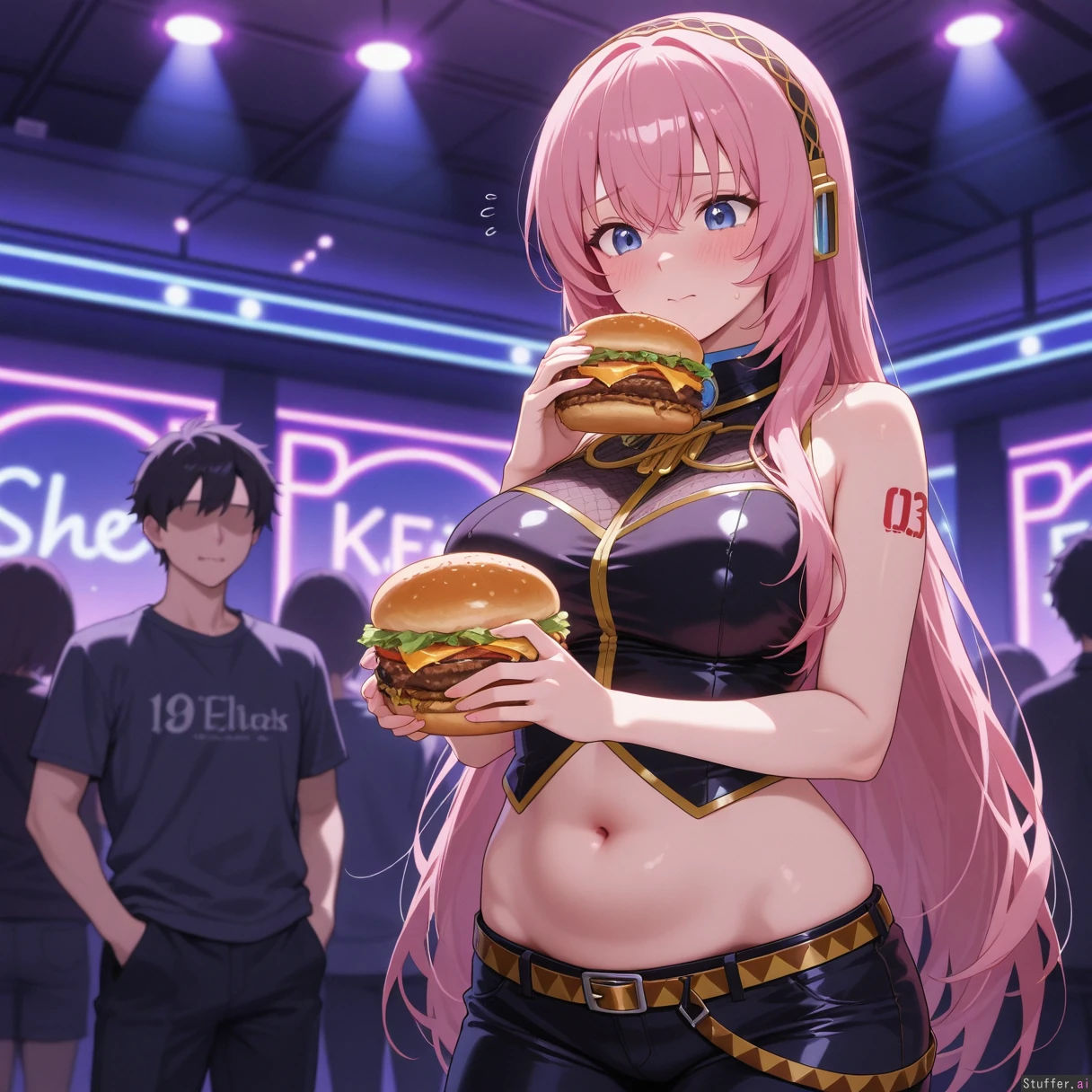 Megurine_Luka, typical clothing, nightclub, ashamed, blushing, anxious. She's gained weight and it shows! She looks softer with an erotically soft belly. she is holding a burger about to eat more as her handsome boyfriend holds her by her flabby chubby waist. High quality, high resolution.