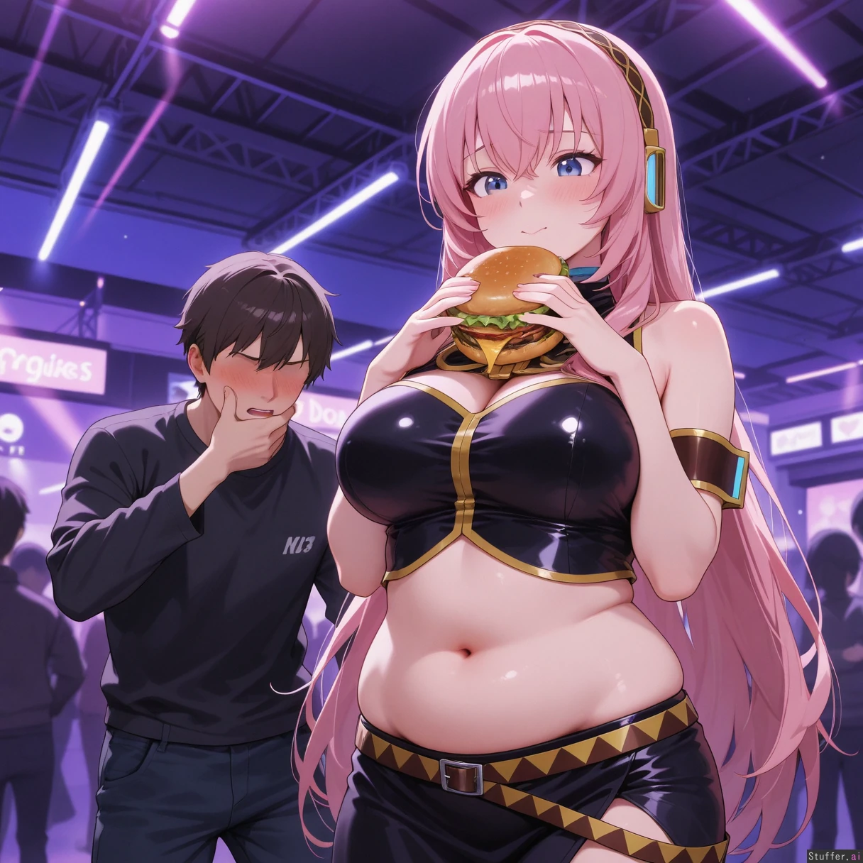 Megurine_Luka, typical clothing, nightclub, ashamed, blushing, anxious. She's gained weight and it shows! She looks softer with an erotically soft belly. she is biting into a burger as her handsome boyfriend holds her by her flabby chubby waist. High quality, high resolution.