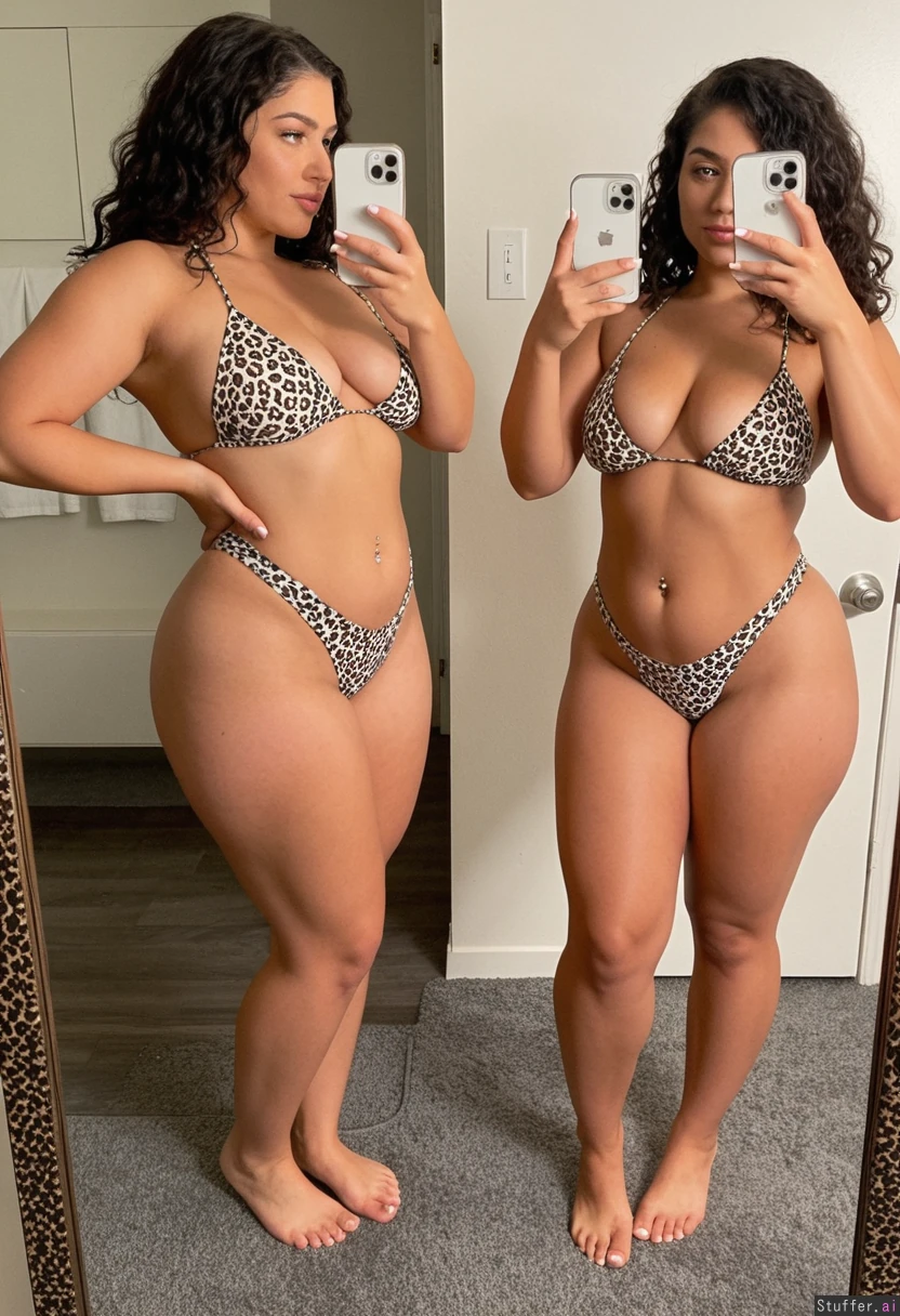 A short statured gorgeous (beautiful popular girl model face) Latina woman with dark wavy hair wearing a cheetah print bikini barefoot toes painted white, Standing taking a mirror selfie. She is a shortstack , pear-shaped_figure , (wide hips) (sexy thick thighs) (bellybutton piercing) (fit) (bottom heavy) Real life, realistic , best_quality She stopped working out and is getting out of shape