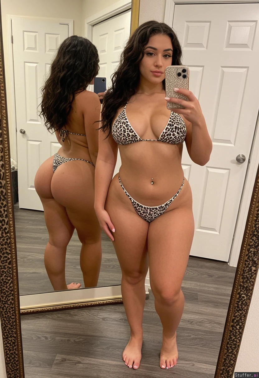 A short statured gorgeous (beautiful popular girl model face) Latina woman in her early twenties with dark wavy hair wearing a cheetah print bikini barefoot toes painted white, Standing taking a mirror selfie. She is a shortstack , pear-shaped_figure , (wide hips) (sexy thick thighs) (bellybutton piercing) (fit) (bottom heavy) Real life, realistic , best_quality She stopped working out and is getting out of shape