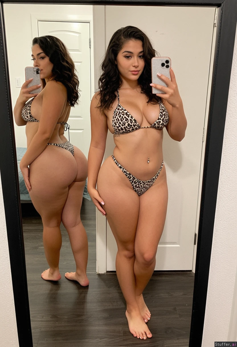 A short statured gorgeous (beautiful popular girl model face) Latina woman in her early twenties with dark wavy hair wearing a cheetah print bikini barefoot toes painted white, Standing taking a mirror selfie. She is a shortstack , pear-shaped_figure , (wide hips) (sexy thick thighs) (bellybutton piercing) (thick) (bottom heavy) Real life, realistic , best_quality She stopped working out and is getting out of shape