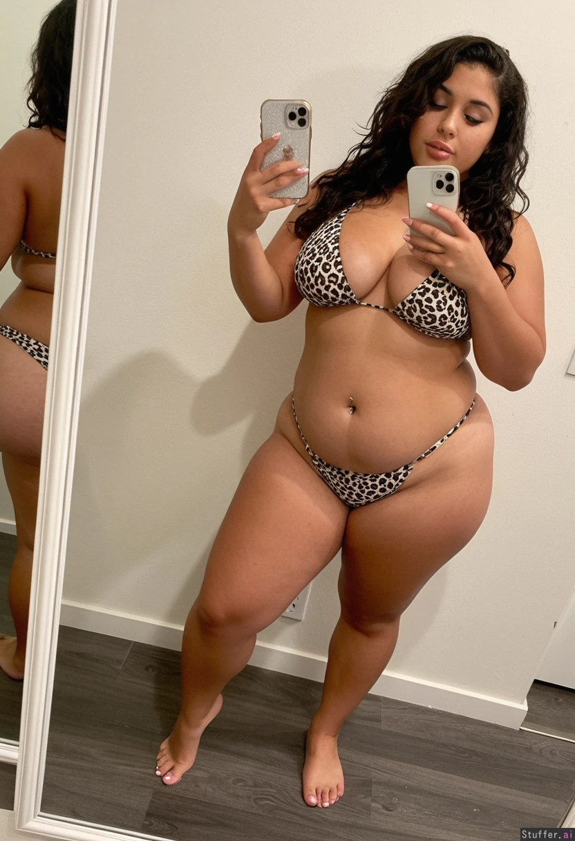A short statured gorgeous (beautiful popular girl model face) Latina woman with dark wavy hair wearing a cheetah print bikini barefoot toes painted white, Standing taking a mirror selfie. She is a shortstack , pear-shaped_figure , (wide hips) (big thick thighs) (bellybutton piercing) (thick) (bottom heavy) (soft belly) Real life, realistic , best_quality She stopped working out and is getting out of shape