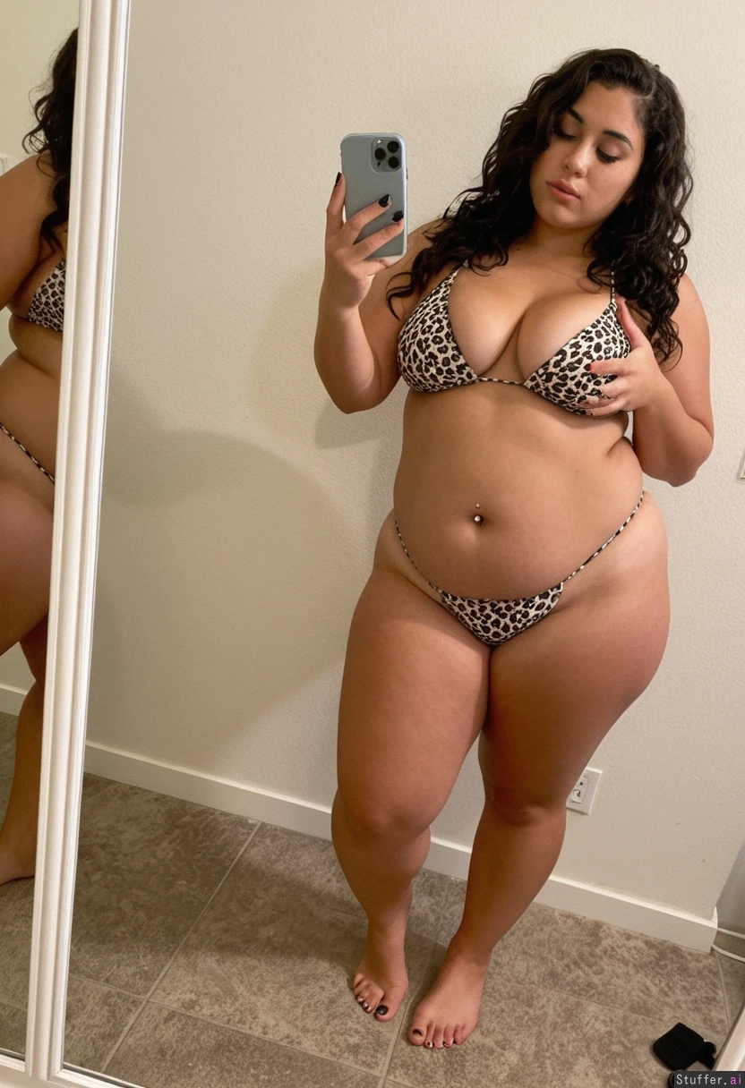 A short statured gorgeous (beautiful popular girl model face) Latina woman with dark wavy hair wearing a cheetah print bikini barefoot toes painted white, Standing taking a mirror selfie. She is a shortstack , pear-shaped_figure , (wide hips) (big thick thighs) (bellybutton piercing) (chubby) (bottom heavy) (soft belly) (fat knees and calves) Real life, realistic , best_quality She stopped working out and is getting out of shape