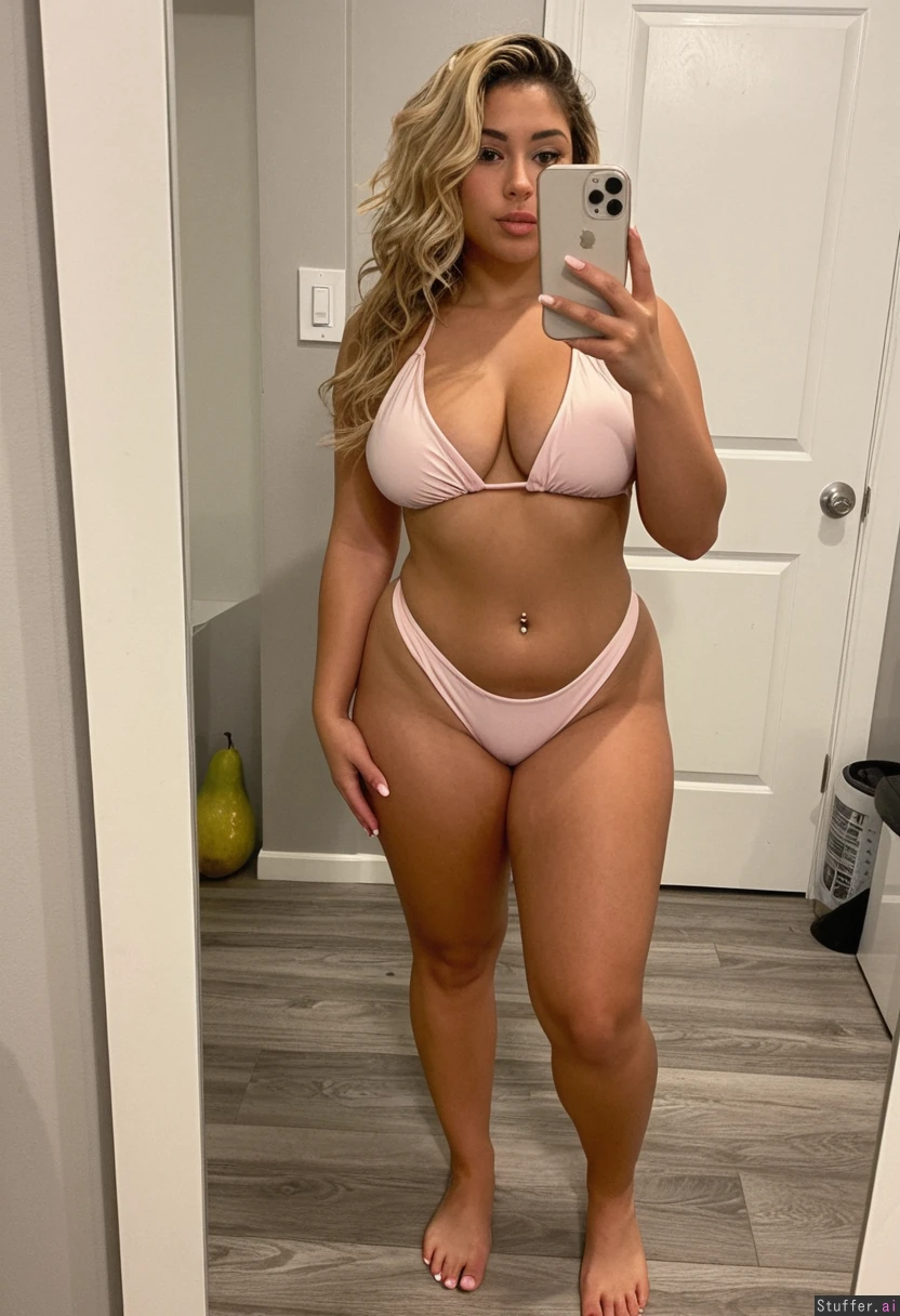 A short statured gorgeous (beautiful popular girl model face) Latina woman in her early twenties with dyed blonde wavy hair wearing a light pink bikini barefoot toes painted white, Standing taking a mirror selfie. She is a shortstack , pear-shaped_figure , (wide hips) (sexy thick thighs) (bellybutton piercing) (fit) (bottom heavy) Real life, realistic , best_quality She stopped working out and is getting out of shape