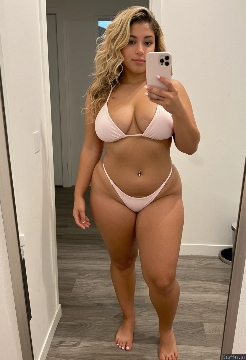 A short statured gorgeous (beautiful popular girl model face) Latina woman in her early twenties with dyed blonde wavy hair wearing a light pink bikini barefoot toes painted white, Standing taking a mirror selfie. She is a shortstack , pear-shaped_figure , (wide hips) (sexy thick thighs) (bellybutton piercing) (thick) (bottom heavy) (gained weight) Real life, realistic , best_quality She stopped working out and is getting out of shape