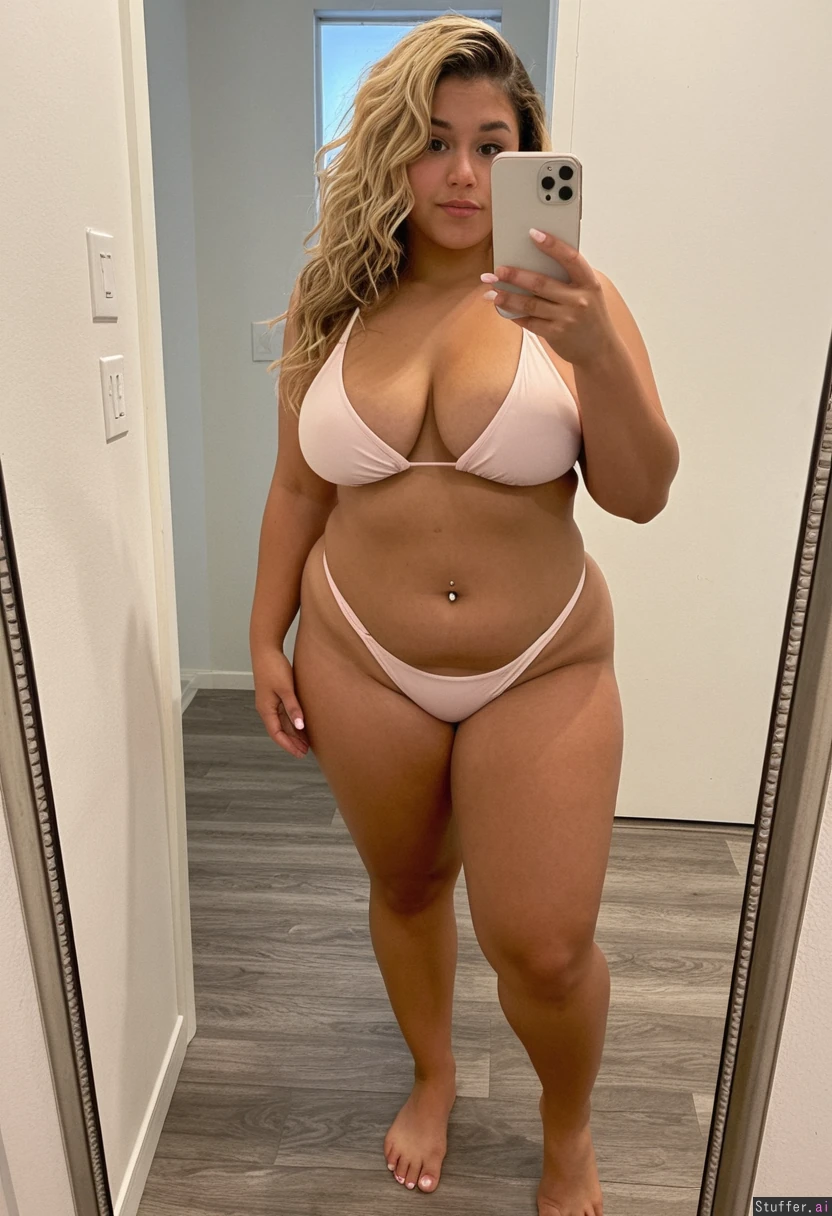 A short statured gorgeous (beautiful popular girl model face) Latina woman in her early twenties with dyed blonde wavy hair wearing a light pink bikini barefoot toes painted white, Standing taking a mirror selfie. She is a shortstack , pear-shaped_figure , (wide hips) (sexy thick thighs) (bellybutton piercing) (chubby) (bottom heavy) (gained weight) Real life, realistic , best_quality She stopped working out and is getting out of shape
