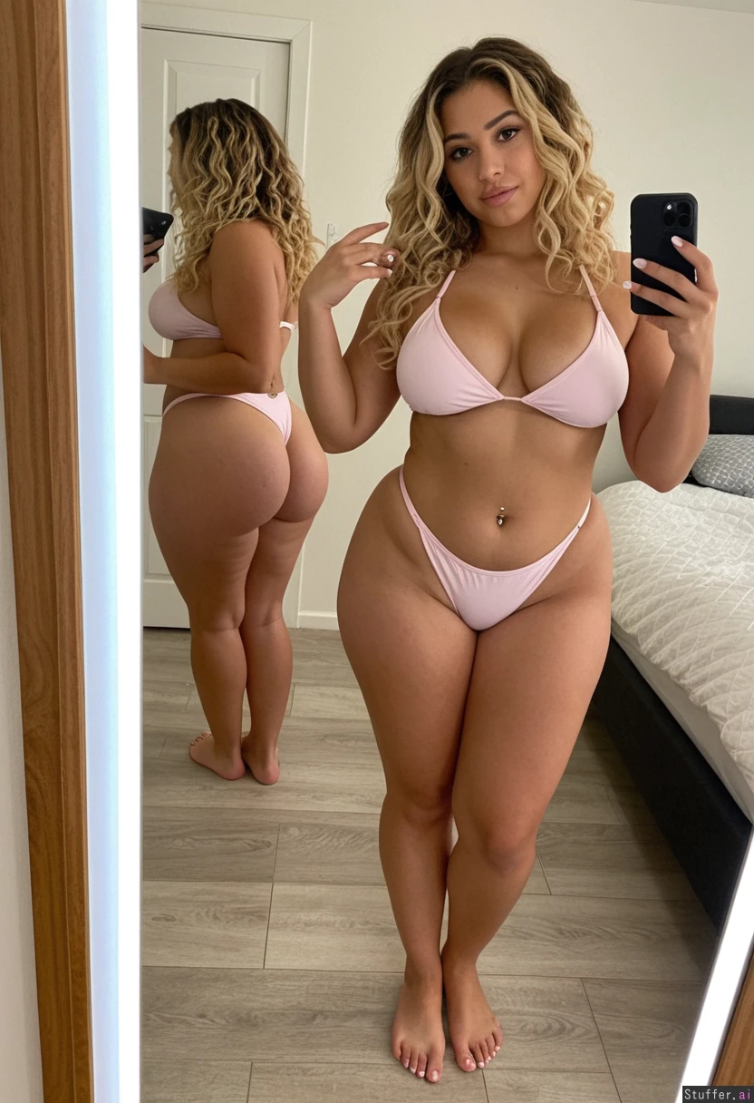 A short statured gorgeous (beautiful popular girl model face) Latina woman in her early twenties with dyed blonde wavy hair wearing a light pink bikini barefoot toes painted white, Standing taking a mirror selfie. Tan She is a shortstack , pear-shaped_figure , (wide hips) (big thick thighs) (bellybutton piercing) (thick) (bottom heavy) (soft body) Real life, realistic , best_quality She stopped working out and is getting out of shape