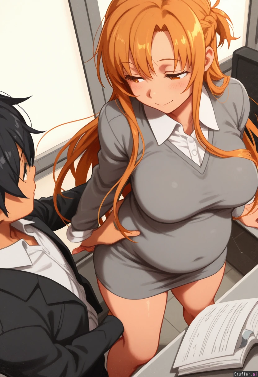 khyle.(artist) romantic_couple, asuna_(sao-alo), kirito, flirting, tight clothes, office clothes, gray dress, belly, legs,curvy, potbelly, stuffed_belly, belly_grab, viewed_from_above