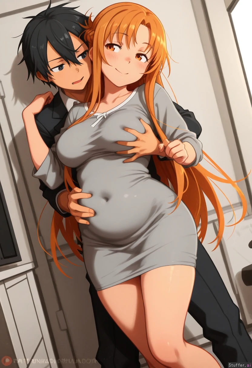 khyle.(artist) romantic_couple, asuna_(sao-alo), kirito, flirting, tight clothes, office clothes, gray dress, belly, legs,curvy, potbelly, stuffed_belly, grabbing_from_behind