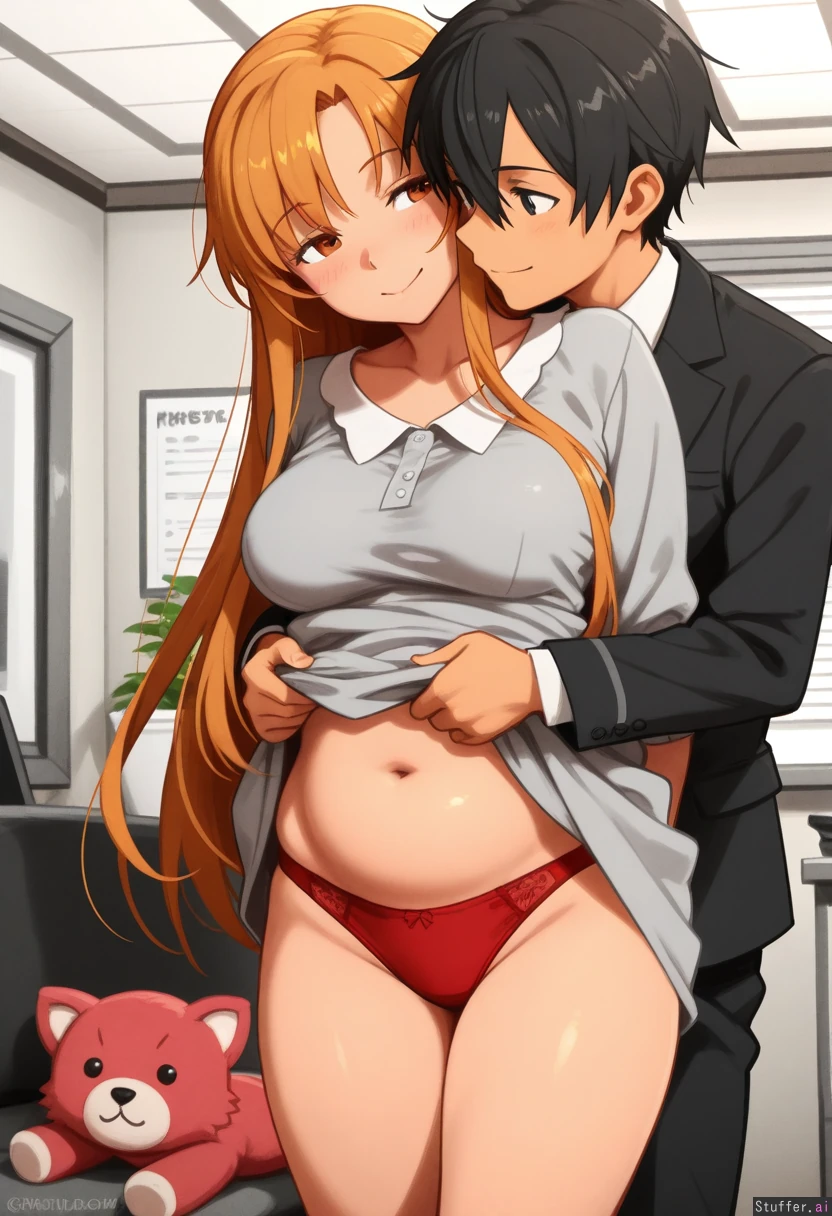 khyle.(artist) romantic_couple, asuna_(sao-alo), kirito, flirting, tight clothes, office clothes, gray dress,red panties, belly, legs,curvy, potbelly, stuffed_belly, dress_lift, grabbing_from_behind