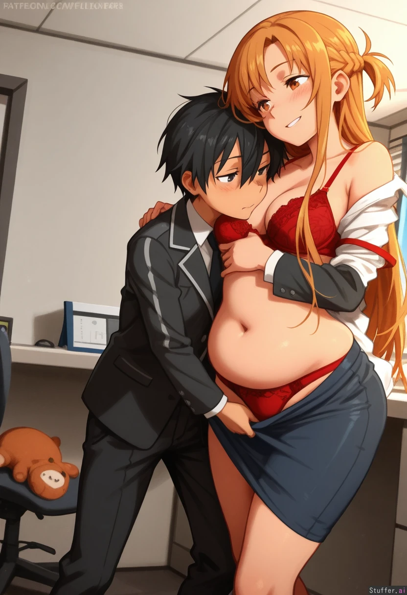 khyle.(artist) romantic_couple, asuna_(sao-alo), kirito, flirting, tight clothes, office clothes, red bra,red panties, belly, legs,curvy, potbelly, stuffed_belly, grabbing_from_behind