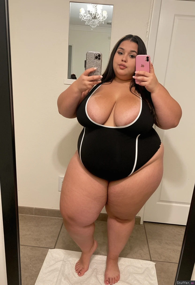 A short statured gorgeous (beautiful popular girl model face) Latina woman in her early twenties with dark long hair wearing a black one piece bathing suit barefoot toes painted white, Standing taking a mirror selfie. Tan She is a hefty shortstack , (wide hips) (big thick thighs) (bellybutton piercing) (morbidly obese) apple-shaped-figure , (obese flabby belly) (SSBBW) Real life, realistic , best_quality