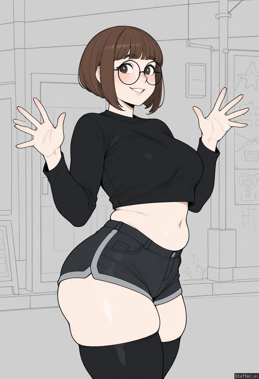 Solo, Krekkov (artist), KAMII MOMORU(artist), ((Flat colors)), perfect proportions, (straight hair hair, brown hair, messy bob haircut), dark eyes, cute face, large cute eyes, pale skin, cute pose, (((round glasses, (black cropped shirt), oversised cropped black shirt, long sleeves, black jean shorts, black thigh highs))), (manga style drawing, (monochrome)), (side view), walking in a driveway, green garden in the background, medium breasts, ((Skinny)), large muffin top (blushing, cute smile, wide eyes, stars in her eyes, waving, saying hi), fat, (thick thighs, fat thighs, bulging thighs, wide hips:1.2), (bigger breasts:1.1), (bigger belly:1.0)