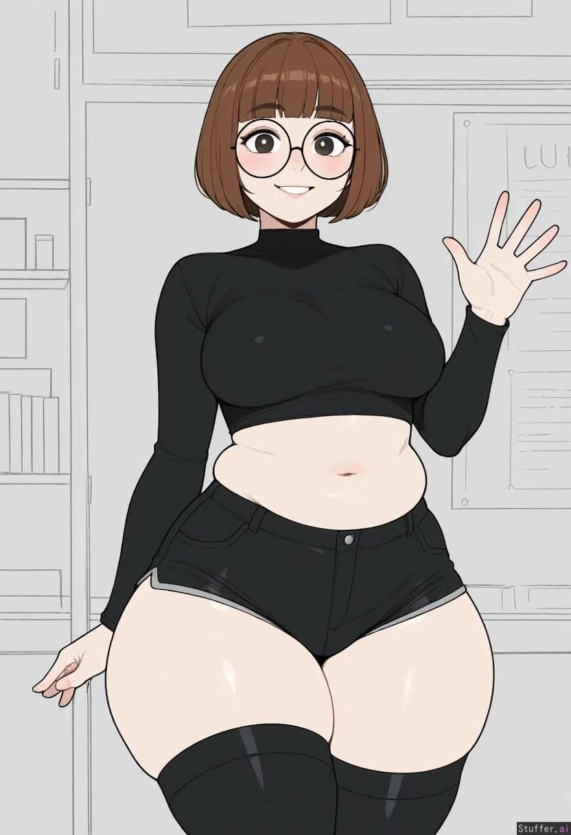 Solo, Krekkov (artist), KAMII MOMORU(artist), ((Flat colors)), perfect proportions, (straight hair hair, brown hair, messy bob haircut), dark eyes, cute face, large cute eyes, pale skin, cute pose, (((round glasses, (black cropped shirt), oversised cropped black shirt, long sleeves, black jean shorts, black thigh highs))), (manga style drawing, (monochrome)), walking in a science lab, lab background, medium breasts, ((Skinny)), large muffin top (blushing, cute smile, wide eyes, stars in her eyes, waving, saying hi), fat, (thick thighs, fat thighs, bulging thighs, wide hips:1.2), (bigger breasts:1.1), (bigger belly:1.0)