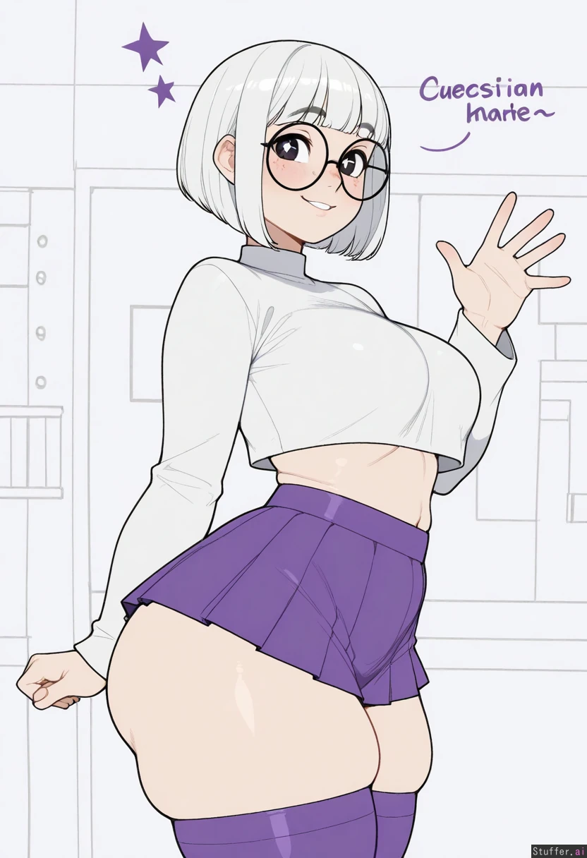 Solo, Krekkov (artist), KAMII MOMORU(artist), (((Flat colors))), perfect proportions, (straight hair hair, white hair, messy bob haircut), dark eyes, cute face, large cute eyes, pale skin, cute pose, (((round glasses, (white cropped shirt), oversised cropped white shirt, long sleeves, purple mini skirt, purple thigh highs))), (manga style drawing, (monochrome)), (side view), walking in a science lab, lab background, medium breasts, ((Skinny)), large muffin top (blushing, cute smile, wide eyes, stars in her eyes, waving, saying hi), fat, (thick thighs, fat thighs, bulging thighs, wide hips:1.2), (bigger breasts:1.1), (bigger belly:1.0)