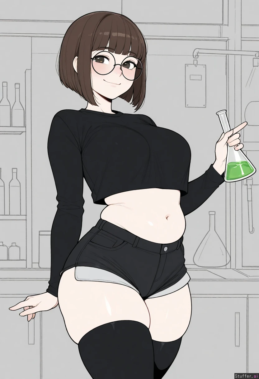 Solo, Krekkov (artist), KAMII MOMORU(artist), ((Flat colors)), perfect proportions, (straight hair hair, brown hair, messy bob haircut), dark eyes, cute face, large cute eyes, pale skin, cute pose, (((round glasses, (loose black cropped shirt), oversised cropped black shirt, long sleeves, black jean shorts, black thigh highs))), (manga style drawing, (monochrome)), walking in a science lab, lab background, chemicals in the background,(Erlenmeyer Flask Glass with green liquid in it in her hand), medium breasts, ((Skinny)), large muffin top (blushing, cute smile), fat, (thick thighs, fat thighs, bulging thighs, wide hips:1.1), (bigger breasts:1.1), (bigger belly:1.0)